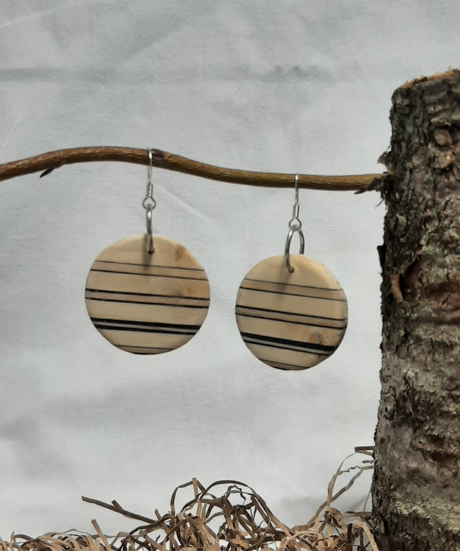 Handmade wooden earrings made by laminaing scrap lumber, yard trimmings and firewood.